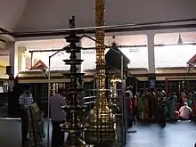 When Anna Nagar was developed as a model town in the late 1960s, the annual vilakku pooja during the mandala makaravilakku season was celebrated by Ayyappa devotees in the newly formed Shanti Colony. The residents' response to this annual celebration resulted in the formation of the Sri Ayyappa Seva Samajam (SASS) in 1976, with 14 members in its committee. In 1979, the Samajam started a charitable medical centre for the poor and needy.[1] The same year, a 7-ground land near the Visveswarayya Tower was allotted to the Samajam by the Tamil Nadu Housing Board for the construction of a temple, for which members contributed ₹ 38,000 towards initial payment.[1] Initially, a makeshift temple was built in a thatched shed along with a charitable medical centre in another shed.[2] Work on the construction of a permanent temple continued for the next five years in consultation with temple architect Kanipayyur Krishnan Namboodiri. The construction was guided by P. N. Subramaniam, the founder-president, P. Chandrasekhara Menon, the second president, and P. V. Nair, and financial support was provided by R. Ratnam, then chairman of Sundaram Industries, and P. Velayudham.[1] In May 1984, the typical Kerala-style temple was completed, conforming to the traditional shastraic stipulations. The kumbabishekam and consecration of the idol were performed on 13 May 1984 by temple Thantri Abli Krishna Vadhyan Namboodiri and K. M. Kesva Battatripad, former chief priest of the Sabarimala Temple.[2] The panchaloha Ayyappan idol was made by Chenganur T. Rajarathinam.[1] Idols of Ganesha, Subramanya, Goddess Durga, and Anjenaya were also consecrated. Later, a Navagraha (the nine planets) shrine was added in the temple. In 1989, a unique architectural structure known as the Natamandapam with an imposing gopuram was added. In 2005, gold covering of the 22-paras (segments) dwajasthambam and 27 thazhikakudams with about 6 kg of gold was completed. A special kumbabishekam of the gold-covered dwajasthambam was performed on 20 June 2005.[2]