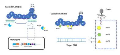 The procedure starts with the CRISPR locus being transcribed into crRNAs (CRISPR RNA). CrRNAs combine with Cas proteins forming a ribonucleoprotein complex called Cascade. This complex surveys the cell to find complementary sequences of the crRNA. When this sequence is found, the Cas3 nuclease is recruited to the Cascade, and the target DNA from the phage is cleaved. But, for instance, when AcrF1 and AcrF2 are found (anti-CRISPR proteins), these interact with Cas7f and Cas8f-Cas5f, respectively, not allowing the binding to the phage DNA. Moreover, the cleaving of the target is prevented by the union between AcrF3 and Cas3.[6]
