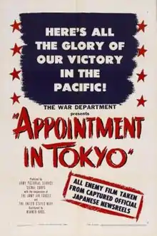 Appointment in Tokyo is a 1945 documentary produced by the Army Pictorial Service, Signal Corps, with the cooperation of the Army Air Forces and the United States Navy, and released by Warner Bros. for the War Activities Committee shortly after the surrender of Japan. It mainly follows General Douglas MacArthur and his men from their exile from the Philippines in early 1942, through the signing of the instrument of surrender on USS Missouri on September 1, 1945.[1]