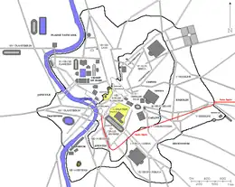 It flowed for 16.4 km (10.2 mi) to Rome from the east and emptied into the Forum Boarium near the Porta Trigemina. Nearly all of its length before entering the city was underground, which was necessary because of the relative heights of its source and destination, and which also afforded it protection from attackers during the Samnite Wars that were underway during its construction.[1] After entering the hilly area of Rome, the aqueduct alternated between tunnels through the Caelian and Aventine Hills and an elevated section. A detailed modern model of ancient Rome shows the aqueduct running along the top of the Servian Wall above the Porta Capena.[4] It dropped only 10 metres (33 ft) over its entire length, making it a remarkable engineering achievement for its day.