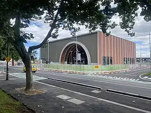 The station's external design, made out of clay brick, will reflect the area's industrial heritage.[16] A café will be included in the station, with areas for outdoor dining. New public gathering space will provide space for locals and passengers to enjoy. As the station may be prone to flooding, drainage at the station has been designed to capture the natural flow of rainwater and distribute it into nearby garden beds.[17]