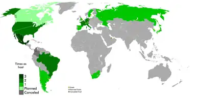 Only Mexico, Italy, France, Germany (West Germany until shortly after the 1990 World Cup) and Brazil have hosted the event on two occasions. Mexico City's Estadio Azteca is the only venue ever to have hosted two FIFA World Cup finals. Only the 2002 FIFA World Cup had more than one host, being split between Japan and South Korea, and in 2026 there will be three hosts: the United States, Canada, and Mexico.