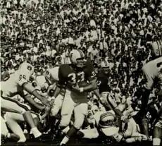 Coach Ray Graves' 1966 Florida Gators and coach Shug Jordan's Auburn Tigers repeatedly traded the lead as they battled back and forth all day.[23] In the fourth quarter with the game tied at 27, Gators quarterback Steve Spurrier was engineering a late drive for the win, but was stopped at Auburn's 39-yard-line following an intentional grounding penalty.[23] The distance was outside the usual range of the Gators regular placekicker, but Spurrier had kicked 40-yard field goals in practice.[24] With 2:12 left in the game, he kicked the 40-yard field goal to give the Gators a 30–27 lead, and the Gators defense held on to win.[25][26] He completed twenty-seven passes on forty attempts for 259 yards, one touchdown pass and no interceptions, and also rushed for a touchdown.[25] Another Gators standout, tailback Larry Smith, finished the day with 102 rushing yards and a touchdown on twenty-two carries, including a 53-yard run.[23] At the conclusion of the 1966 season, Spurrier was awarded the Heisman Trophy.[27][28]