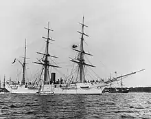 The ships were powered by a single 2-cylinder, horizontal triple-expansion steam engine that drove a screw propeller. The number and type of boilers is not known, but smoke from the boilers was vented through a single funnel located amidships, between the fore- and main mast. The propulsion system was capable of generating 1,000 indicated horsepower (750 kW), for a top speed of 11 knots (20 km/h; 13 mph). On her initial sea trials, Aurora reached a top speed of 11.2 knots (20.7 km/h; 12.9 mph) from 1,165 ihp (869 kW); trials data for the other two ships has not survived. The ships were fitted with a three-masted barque sailing rig to supplement the steam engine on long voyages.[2][3]