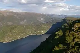 Austfjorden is a fjord in Vestland county, Norway. The 20-kilometre (12 mi) long fjord runs along the border between Alver Municipality and Masfjorden Municipality. It starts in Alver and extends to the northwest. The Masfjorden joins the Austfjorden from the north, and then the Austfjorden empties into the Fensfjorden before reaching the open sea near Fedje. The Austfjorden is the innermost arm of the Fensfjorden. The village of Knarrviki and the Mongstad industrial area lie on the western shore of the Austfjorden. The village of Myking lies on the western shore of the fjord, near the innermost part of the fjord.[1]
