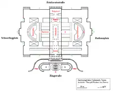 The group of figures in the gable are made of Laas marble and depict the allegorical times of the day. The columns and pilasters of the wall are made of marble from Untersberg, the stylobates of dark marble, the decorations of the doors of red Salzburg marble. The wall space between the pillars is made of grey scagliola, with niches in between decorated with statues made of Carrara marble. The statues show historical persons such as Numa Pompilius, Cincinnatus, Quintus Fabius Maximus, Cato the Elder, Gaius Gracchus, Cicero, Manlius Torquatus, Augustus, Seneca the Younger and Constantine the Great.[1] The friezes above were painted by August Eisenmenger and depict the history of the emergence of civic life. Starting from left to right it shows: