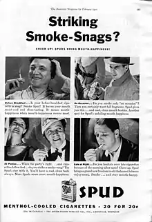 Menthol cigarettes were first developed by Lloyd "Spud" Hughes of Mingo Junction, Ohio, in 1924,[1] though the idea did not become popular until the Axton-Fisher Tobacco Co. acquired the patent in 1927, marketing them nationwide as "Spud Menthol Cooled Cigarettes". Spud brand menthol cigarettes went on to become the fifth most popular brand in the US by 1932,[2] and it remained the only menthol cigarette on the market until the Brown & Williamson Tobacco Company created the Kool brand in 1933.
