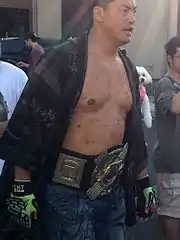 Record seven-time, longest single and combined reigning champion Ryuji Ito with the title belt in August 2015.
