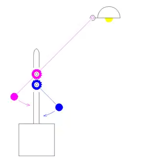A lamp type like the Tizio works like this. A balancing arm (the forearm) has on one side of an axis a small counterweight and on the other side a lamp cap. These parts are lifted by a second bigger balancing arm (the upper arm) that has on the other side of a second axis a heavier counterweight. The lamp designed by Edouard-Wilfrid Buquet in 1927 works in this way. The lamp is in the collection of the Museum of Modern Art. The two axes have a different angle, and this has some advantages.