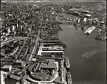 The Great Depression gave East Darling Harbour and dock areas surrounding it a poignant nickname, The Hungry Mile. During this period great masses of workers would line up down the mile long stretch of wharfs and wait for work.[16] Clerks chose the workers based on the a system where the fitter men were chosen over the weaker, and where socialist troublemakers were sidelined in favour of willing workers. This brutal system made for a very adversarial environment which polarised the community at large. They erupted occasionally in protest, most famously refusing to load a boat with scrap metal bound for Japan on the eve of World War II.[17]