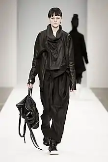 In her fashion designs, she makes extensive use of draping and layering techniques, often creating asymmetrical garments that can be worn in multiple ways. Juxtaposition and deconstruction play a central part, with Gongini predominantly using black and non-colors 'to allow fabrics and textures to speak as color instead'.[3] She combines a variety of natural and recycled textiles, sometimes mixing several types of materials, such as wool, leather, cotton and plastic, in a single garment.[12] Gongini's leather garments are often treated to give a dramatic texture that is reminiscent of the Faroese landscape.[13] Her designs are available at the BARBARA I GONGINI headquarters showroom in Copenhagen and in specialized avant-garde clothing stores worldwide. Gongini's avant-garde design philosophy means that the collections are not trend-based, but focus on 'nurturing a longevity formula'.[3] She often compares her collections to new chapters to turn to in a story, describing them as 'numerical'.[14] As a proponent of the zero-waste wardrobe, she seeks to lengthen the life-cycle of garments through innovative designs called 'multiways'. [4]