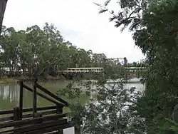 Barham's development was aided when a lift span bridge across the river opened in 1904, designed by Ernest de Burgh of the Department of Public Works and constructed by Monash & Anderson, with John Monash in charge. The bridge replaced a punt that was used to ferry people, stock and goods across the river, and allowed road access between the Riverina and the Victorian markets, while permitting the passage of paddle steamers when the middle section was raised. Until it was motorised in 1997 it was operated by a system of weights worked by two men turning wheels. The span is still occasionally raised. The bridge is now one of the oldest remaining across the Murray River.[6] A similar bridge was constructed upstream at the same time between Cobram, Victoria and Barooga, New South Wales.