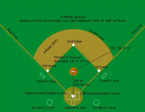 Diagram of a baseball field Diamond may refer to the square area defined by the four bases or to the entire playing field. The dimensions given are for professional and professional-style games. Children often play on smaller fields.