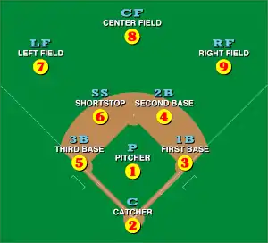 Defensive positions on a baseball field, with abbreviations and scorekeeper's position numbers (not uniform numbers)