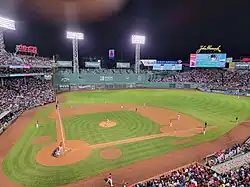 A baseball game is played between two teams, each usually composed of nine players, that take turns playing offense (batting and baserunning) and defense (pitching and fielding). A pair of turns, one at bat and one in the field, by each team constitutes an inning. A game consists of nine innings (seven innings at the high school level and in doubleheaders in college, Minor League Baseball and, since the 2020 season, Major League Baseball; and six innings at the Little League level).[3] One team—customarily the visiting team—bats in the top, or first half, of every inning. The other team—customarily the home team—bats in the bottom, or second half, of every inning. The goal of the game is to score more points (runs) than the other team. The players on the team at bat attempt to score runs by touching all four bases, in order, set at the corners of the square-shaped baseball diamond. A player bats at home plate and must attempt to safely reach a base before proceeding, counterclockwise, from first base, to second base, third base, and back home to score a run. The team in the field attempts to prevent runs from scoring by recording outs, which remove opposing players from offensive action, until their next turn at bat comes up again. When three outs are recorded, the teams switch roles for the next half-inning. If the score of the game is tied after nine innings, extra innings are played to resolve the contest. Many amateur games, particularly unorganized ones, involve different numbers of players and innings.[4]