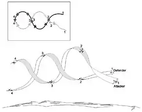 Rolling scissors, also called vertical scissors, tend to happen after a high-speed overshoot from above. The defender reverses into a vertical climb and into a barrel roll over the top, forcing the attacker to attempt to follow. The advantage lies in the aircraft that can pull its nose through the top or bottom of the turn faster. In battles with aircraft that have a thrust-to-weight ratio of less than one the aircraft will quickly lose altitude, and crashing into the ground becomes a possibility.[58] According to author Mike Spick, "Disengagement from a vertical rolling scissors is best made with a split-s and a lot of hope."[59]
