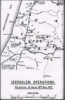 Allenby's plan was to avoid fighting in or near Jerusalem but to cut all road access to the city and force the Ottoman Army to evacuate it.[33] He ordered two infantry divisions; the 52nd (Lowland) (Major General J. Hill) and the 75th Division (Major General P. C. Palin), and two mounted divisions; the Yeomanry and the Australian Mounted Divisions to begin the advance.[Note 2] They were to move eastwards from Latron, which had been captured on 16 November, in the same direction as the Jaffa to Jerusalem road.[31][34]