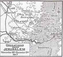The Battle of Jerusalem occurred during the British Empire's "Jerusalem Operations" against the Ottoman Empire, in World War I, when fighting for the city developed from 17 November, continuing after the surrender until 30 December 1917, to secure the final objective of the Southern Palestine Offensive during the Sinai and Palestine Campaign of World War I. Before Jerusalem could be secured, two battles were recognised by the British as being fought in the Judean Hills to the north and east of the Hebron–Junction Station line. These were the Battle of Nebi Samwill from 17 to 24 November and the Defence of Jerusalem from 26 to 30 December 1917. They also recognised within these Jerusalem Operations, the successful second attempt on 21 and 22 December 1917 to advance across the Nahr el Auja, as the Battle of Jaffa, although Jaffa had been occupied as a consequence of the Battle of Mughar Ridge on 16 November.[4]