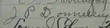Signature of J. P. Donnelley. Leader of the posse involved in the Battle of Kelley Creek. The signature is taken from a registered mail signing book from Carson City, NV - 1812 - 1813. In the private collection of H. Blair Howell.