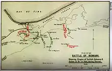 The 52nd (Lowland) Division developed a strong defensive position at Romani which had its left flank on the Mediterranean Sea, here a series of redoubts were built running southwards from Mahamdiyah along the line of high sand hills about 7 miles (11 km) to a dune known as Katib Gannit 100 feet (30 m) high. This line of sand hills, which were high enough to see Katia oasis from, marked the eastern edge of an area of very soft and shifting sand beyond which were lower dunes and harder sand where movement by both infantry and mounted forces was considerably easier. Between the shore at the western end of the Bardawil Lagoon and Katib Gannit (the principal tactical point on the eastern slopes of the Romani heights), the infantry constructed a line of 12 redoubts about 750 yards (690 m) apart, with a second series of redoubts covering the Romani railway station and the right of the defensive position which curved like a hook westward, then northward. A total of 18 redoubts were constructed, which when fully garrisoned held from 40 to 170 rifles each, with Lewis guns and an average of two Vickers machine guns allotted to each position; they were well wired on the right side of each of the positions, although there was no wire between the redoubts.[46] This defensive line was supported by artillery.[47][48]