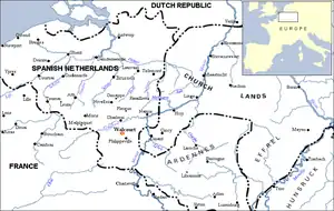 On 14 May 1689, Humières assembled his army for the new campaign in the Spanish Netherlands near Boussières on the river Sambre, where he marshalled 24 battalions and 75 squadrons, totalling 24,000 men.[10] William entrusted overall command of his 35,000 troops in the theatre to the 69-year-old Prince of Waldeck. The English contingent of 8,000 men was commanded by the Earl of Marlborough, but William remained sceptical about the quality of the English troops; compared to the Dutch troops of the period, the English lacked organisation, field administration, and a commissariat.[11] However, Waldeck watched with interest as Marlborough sought to bring order and organisation to his command, later writing that he hoped the English " … were as disciplined as they were brave" – although by September Waldeck was still lamenting their " … temperament, nonchalance, wretched clothing and the worst of shoes."[11]