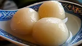 The tangyuan, or Ningbo sweet dumpling, is created by mixing black sesame seeds, lard, and sugar together as the filling, which is placed into a sticky rice ball, which is then fried or boiled. The filling is occasionally changed by substituting the sesame filling with pork, durian, and red bean paste.