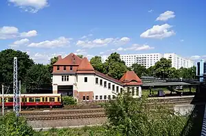 Pankow-Heinersdorf station was opened on 1 October 1893. The station was one of the first S-Bahn stations, as S-Bahn services started operated upon the electrification of the line in 1924.[2] On 25 April 1945, the S-Bahn ceased operation as a result of the Soviet invasion of Berlin. Services resumed from Pankow-Heinersdorf on 11 June 1945.