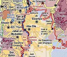 Israeli separation barrier at Abu Dis & Al-Eizariya, 1990s- 2004–2007. This shows a portion of the barrier built by Israel in the West Bank. This part is very close to the eastern part of Jerusalem, ~2 km from al-Aqsa Mosque. It is taken on the Israeli side of the wall, facing south. The local residents on both sides of the barrier at this point consist of predominantly Palestinians Families.