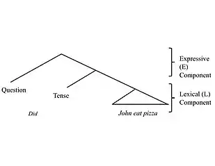 The L component words of this sentence are the content words John, eat, and pizza. Each word only contains lexical information that directly contributes to the meaning of the sentence. The L component is often referred to as the base or inner component, due to the inwards positioning of this constituent in a phrase structure tree. It is evident that the string of words ‘John eat pizza’ does not form a grammatically well-formed sentence in English, which suggests that E component words are necessary to syntactically shape and structure this string of words. The E component is typically referred to as the outer component that shapes the inner L component as these elements originate in a position that orbits around the L component in a phrase structure tree. In this example, the E component function word that is implemented is did. By inserting this word, two types of structures are added to the expression: tense and clause typing. The word did is a word that is used to inquire about something that happened in the past, meaning that it adds the structure of the past tense to this expression. In this example, this does not explicitly change the form of the verb, as the verb eat in the past tense still surfaces as eat without any additional tense markers in this particular environment. Instead the tense slot can be thought of as being filled by a null symbol (∅) as this past tense form does not have any phonological content. Although covert, this null tense marker is an important contribution from the E component word did. Tense aside, clause typing is also conveyed through the E component. It is interesting that this function word did surfaces in the sentence initial position because in English, this indicates that the string of words will manifest as a question. The word did determines that the structure of the clause type for this sentence will be in the form of an interrogative question, specifically a yes–no question. Overall, the integration of the E component with the L component forms the well-formed sentence, Did John eat pizza?, and accounts for all other utterances found in human languages.