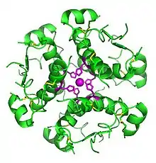 Computer-generated image of insulin hexamers highlighting the threefold symmetry, the zinc ions holding it together, and the histidine residues involved in zinc binding