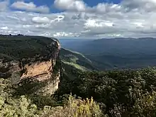 View from Wentworth Falls carpark - The Giant Stairway[45] walking track runs down a cliff into the Jamison Valley, near the Three Sisters, providing access to nature walks[46] through the valley.[20]: 212–220
