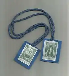 The Blue Scapular of the Immaculate Conception (most known as simply Blue Scapular) is a devotional scapular that traces its roots to Venerable Ursula Benincasa, who founded the Roman Catholic religious order of the Theatine Nuns.[1] This scapular must have a blue woollen cloth and on one side bears a symbolization of the mystery of the Immaculate Conception of Our Lady and on the other the name of the Blessed Virgin Mary.