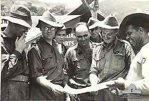 - ↑ This photograph, held by the Australian War Museum, was obviously taken at the same time, with the same subjects, and in the same location as , and .