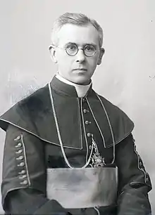 In spring 1913, Borisevičius was posted as a vicar and prison chaplain to Kalvarija.[10] During World War I, when Germans briefly captured Kalvarija, Borisevičius was taken as a hostage and later faced Russian inquiries for collecting German-imposed contributions.[11] Later, he and his family evacuated to Minsk where he sheltered three seminary students. In 1916–1917, he worked as a chaplain of the 10th Army of the Russian Imperial Army.[12] In June 1917, he as a representative of the Lithuanian Christian Democratic Party participated in the Petrograd Seimas.[13] In Minsk, he organized financial aid for Lithuanian students and received a silver tableware set from Madeleine Radziwiłł worth 30,000 rubles which became the basis for the charitable fund of the Catholic youth federation Ateitis and was later used to finance the construction of its headquarters in Kaunas.[11] When Minsk was captured by the Germans, he briefly worked as a theology teacher at a Gymnasium in Minsk.[3]
