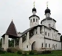 Prior to the construction of its own church at Borodino, people from the area were parishioners of the church of the Exaltation of the Holy Cross, which was on the other side of the Kolocha River at the confluence of the Stonets and Prudki creeks.[6] This church with a chapel (the lower church) in honour of St. Nicholas, Archbishop of Myra was destroyed in the Time of Troubles, probably in 1609. After that, the locals were parishioners in the church of the Assumption in the village Semenov also having a lower chapel of St. Nicholas.[6] There is no further history of this church following the middle of the 17th century.