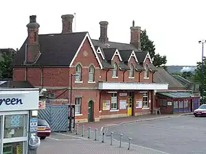 Wrotham station opened on 1 June 1874, as part of the Maidstone Line from Swanley to Maidstone.[1] The station was initially named after Wrotham, which lies 1 mile (1.6 km) to the north. The station was later renamed Wrotham & Borough Green, and then Borough Green & Wrotham as Borough Green grew in size relative to Wrotham.[2] The goods yard had three sidings. One of them served a goods shed, another extended northwards to serve a Ragstone quarry.[3] A 5-ton capacity crane was provided.[4] Freight facilities were withdrawn on 9 September 1968.[5] East of the station, there was a private siding at Platt,[6] and a public siding at Offham. This closed on 6 September 1961.[2]