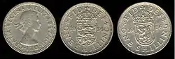 ELIZABETH II DEI GRATIA REGINA FIDEI DEFENSOR[58]Elizabeth II, by the Grace of God, Queen, Defender of the FaithThe "of all the Britains" was dropped from the coinage in 1954, and current coins do not name any realm.