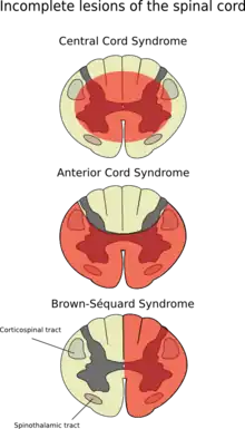 Brown-Séquard syndrome is an incomplete spinal cord lesion characterized by findings on clinical examination which reflect hemisection of the spinal cord (cutting the spinal cord in half on one or the other side). It is diagnosed by finding motor (muscle) paralysis on the same (ipsilateral) side as the lesion and deficits in pain and temperature sensation on the opposite (contralateral) side. This is called ipsilateral hemiplegia and contralateral pain and temperature sensation deficits. The loss of sensation on the opposite side of the lesion is because the nerve fibers of the spinothalamic tract (which carry information about pain and temperature) crossover once they meet the spinal cord from the peripheries.