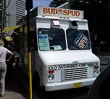 Bud the Spud is an iconic chip truck in Halifax, Nova Scotia, Canada.[1] In operation since 1977, it is parked outside the Spring Garden Road branch of the Halifax Public Libraries each summer.[2] The edge of the old library is marked by a low concrete wall, and it is there that most customers sit and eat their fries. The truck sells hand-cut French fries made from Prince Edward Island potatoes,.[3] It currently offers French fries, fish and chips, hot dogs, poutine, and drinks.