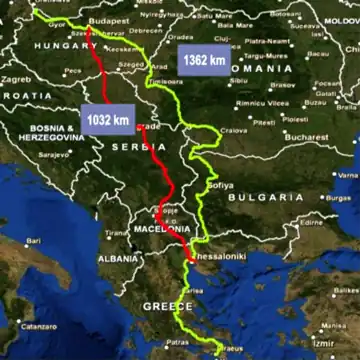 In a 2012/13 EC report, Priority Project 22: Railway axis Athens–Sofia–Budapest–Vienna–Prague–Nuremberg/Dresden (PP22),[1] the planners included their considerations of the Balkan route, which follows Pan-European Corridor X through Austria, Slovenia, Croatia, Serbia, North Macedonia and Greece (Thessaloniki–Skopje–Belgrade–Budapest/Zagreb–Ljubljana–Graz/Salzburg) and shortens the present Athens–Budapest route via Bulgaria and Romania by 330 km (210 mi). The total length is around 1,030 km (640 mi) compared to 1,362 km (846 mi) for the current southern Athens–Budapest part of PP22. Moreover, there were also a number of technical advantages of this proposed part of the Balkan route: 89% of it was electrified, as against 75% of the present PP22 route and the tracks were designed for higher maximum speeds overall. Nevertheless 64% of the planned line was still single track, compared to 54% of the present part of the PP22 route.
