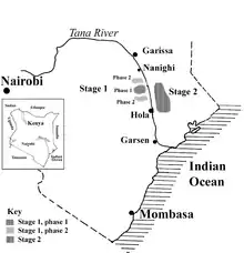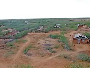 While priority was given to local inhabitants, tenants for Bura were drawn from all parts of Kenya.[30] They had to meet the following criteria: heads of households must be aged between 25 and 45 years and preferably married, must be landless, unemployed or underemployed or earn an income below the minimum agricultural wage, must be medically and physically fit, must provide the equivalent of four adult labour units, must be of good character and should have a rural or farming background. Late 1981 the first group of about 330 settlers arrived and by mid 1984 the total number of tenants living in the scheme was 1,802.[31] They came from Coast Province (35%), Central (24%), Eastern (13%), Nyanza (8%), Western (8%), Rift Valley (6%) and others (6%). In 1988 the number of tenants was estimated at 2,139. Life at Bura was difficult for the tenants and desertion rates in the period 1981-1984 were estimated at between 20 and 30%.[32]