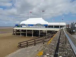 The pier was built in 1914, being finished shortly before the outbreak of the First World War in July.[1] It is said to have been inspired by the works of Victorian engineer Isambard Kingdom Brunel and has been described as the first pier to be built of reinforced concrete rather than the steel and cast iron used previously.[2] The pier measures 37 metres (121 ft) in length and has been described as the shortest pier in the United Kingdom, though some authorities do not classify it as a pier.[3][1] The Bristol Channel has the second-highest tidal range in the world which means that at low tide the sea can be as far as 1.5 miles (2.4 km) from the pier.[3] The pier is occupied by a building, known as the pavilion, which houses a 100-seat café, a bingo hall and an amusements arcade.[3]