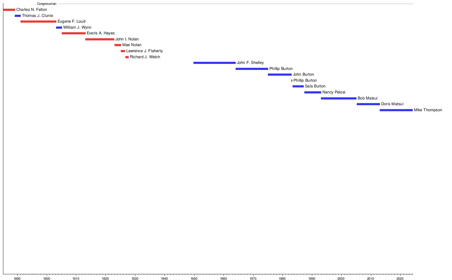 The following timeline depicts the progression of the representatives and their political affiliation at the time of assuming office.