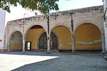 The open chapel and baptistery area is the oldest surviving part of the complex. The chapel is believed to have been built in 1529 by the Franciscans that came to evangelize the area and one of the first of its kind in New Spain.[3][5] One unusual characteristic of the chapel is that the four arches are asymmetrical.[5] It has been listed as a historic monument by INAH as it combines European and indigenous elements. The baptistery contains the originally 16th-century font.[4] Despite its importance historically, the open chapel is the least visited monument in the State of Mexico. The main reason is that it is not as well known as contemporaries such as the monastery in Acolman.[3]