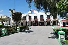 The plaza area is bordered on the east by Juárez Street. Directly across this street is the clock tower and the former Franciscan monastery and current parish church. The clock tower was built in 1910, as part of preparations for the Centennial of Mexico's Independence.[1]
