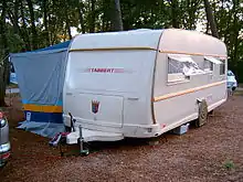 A caravan, travel trailer, camper, tourer or camper trailer is a trailer towed behind a road vehicle to provide a place to sleep which is more comfortable and protected than a tent (although there are fold-down trailer tents).[1][2] It provides the means for people to have their own home on a journey or a vacation, without relying on a motel or hotel, and enables them to stay in places where none is available. However, in some countries campers are restricted to designated sites for which fees are payable.