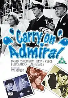Carry on Admiral (released in the United States as The Ship Was Loaded) is a 1957 British comedy film directed by Val Guest and featuring David Tomlinson and Ronald Shiner; Joan Sims, who later became prominent in the Carry On series, has a small part.[1] It predates and was not part of the Carry On series, and does not share any regular cast members beyond Sims, though it is similar in tone and style to the earliest films in the series.[2] Joan Hickson also made an appearance in this film and a few films in the Carry On series.[3] It was based on the 1947 stage play Off the Record, written by Ian Hay.[4]