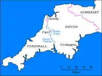 William Cary (1576–1652), son and heir of George Cary (1543-1601), was Justice of the Peace for Devon, MP for Mitchell, Cornwall, in 1604,[31] eldest son and heir by his father's first wife. He is sometimes said to be the model for Will Cary featured in Westward Ho!,[32] the 1855 novel by Charles Kingsley (1819–1875), who appears in the narrative concerning the Spanish Armada in 1588, although he would have been a boy aged just 12 at the time. However the "daring foreign exploits attributed to him are entirely fictional".[31] Kingsley spent much of his childhood at Clovelly as his father was Rev. Charles Kingsley, Curate of Clovelly 1826-1832 and Rector 1832-1836. Indeed the author's small brass monumental tablet is affixed to the wall of the church under the mural monument of Sir Robert Cary (1610–1675), eldest son of William Cary (1576–1652).[32]