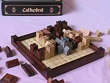 Cathedral, also known as Cathedral: The Game of the Mediaeval City, is a two-player abstract strategy game designed by Robert Moore and first published in 1979, in which dark and light factions vie for territorial supremacy within the bounds of a medieval city. Players play pieces to capture territory on a game board, attempting to place all or most of their game pieces while preventing their opponent from doing likewise. The game's copyright is currently owned by Chrisbo I.P. Holdings Limited in New Zealand.[1]