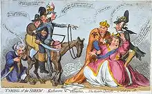 A 1791 caricature by James Gillray of an attempted mediation between Catherine the Great (on the right, supported by Austria and France) and the Ottoman Empire. William Pitt the Younger is shown in armour riding George III, his horse.
